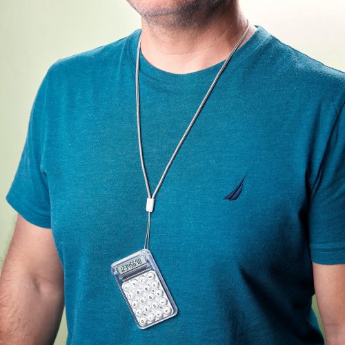Calculadora de 8 dígitos. Ideal para funciones básicas. Incluye cordón de 40 cm. Batería de botón incluida.