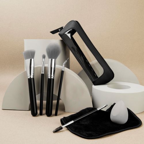 Set de maquillaje con 7 accesorios esenciales para realzar tu belleza. Incluye un elegante estuche y todo lo que necesitas para lograr un look perfecto: brochas para base en polvo, rubor, sombra, delineador de ojos y labios, esponja para base de maquillaj
