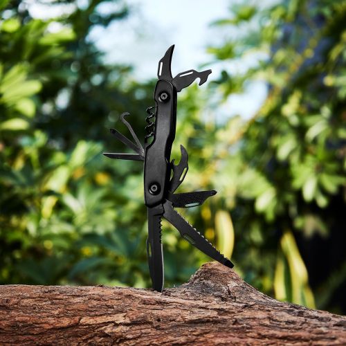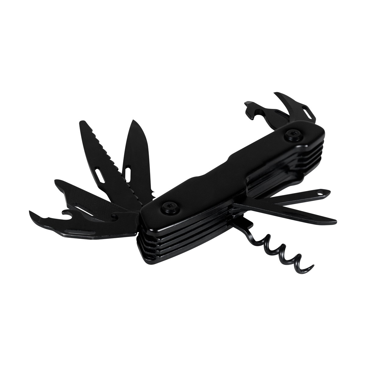 Navaja metálica con 12 funciones. Incluye 1 navaja, 1 destornillador, 1 destornillador plano, 1 destornillador pequeño, 1 abrelatas, 1 lima, 1 sacacorchos, 1 guía de hilo, 1 punzón para cuero, 1 cortador de cajas, 1 destapador y 1 cuchilla peque&nt