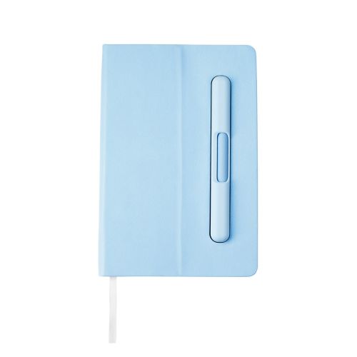 Libreta con 96 hojas a raya. Pasta plegable que funciona como base para smartphone. Cubierta rígida de curpiel que incluye un bolígrafo desmontable y listón separador de hojas. Con este práctico set, estarás siempre listo para plasmar tus ideas en cualqui