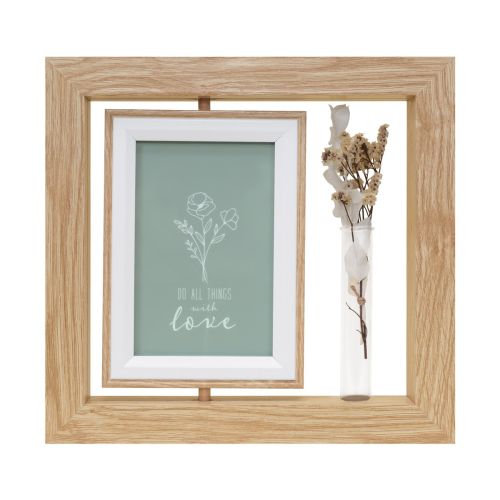 Su diseño elegante y atemporal resalta la belleza de tus fotos favoritas. Contiene un marco girable para fotografías de 10 x 15 cm y un recipiente de vidrio con flores secas. Añade un toque cálido y natural a tus espacios. Incluye caja indiv
