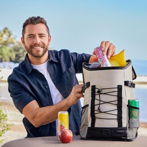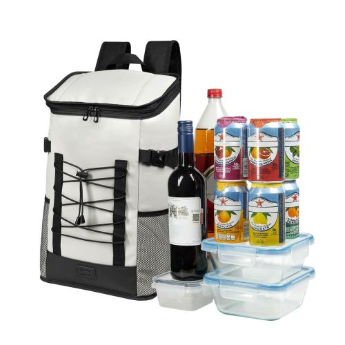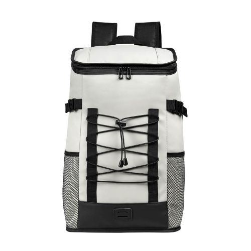 Hielera con función de mochila, con interior plastificado impermeable. Espacioso compartimento principal con cierre, pequeño bolsillo con cierre en la parte superior y 2 bolsillos laterales de red. Al frente, incluye elástico ajustable para llevar