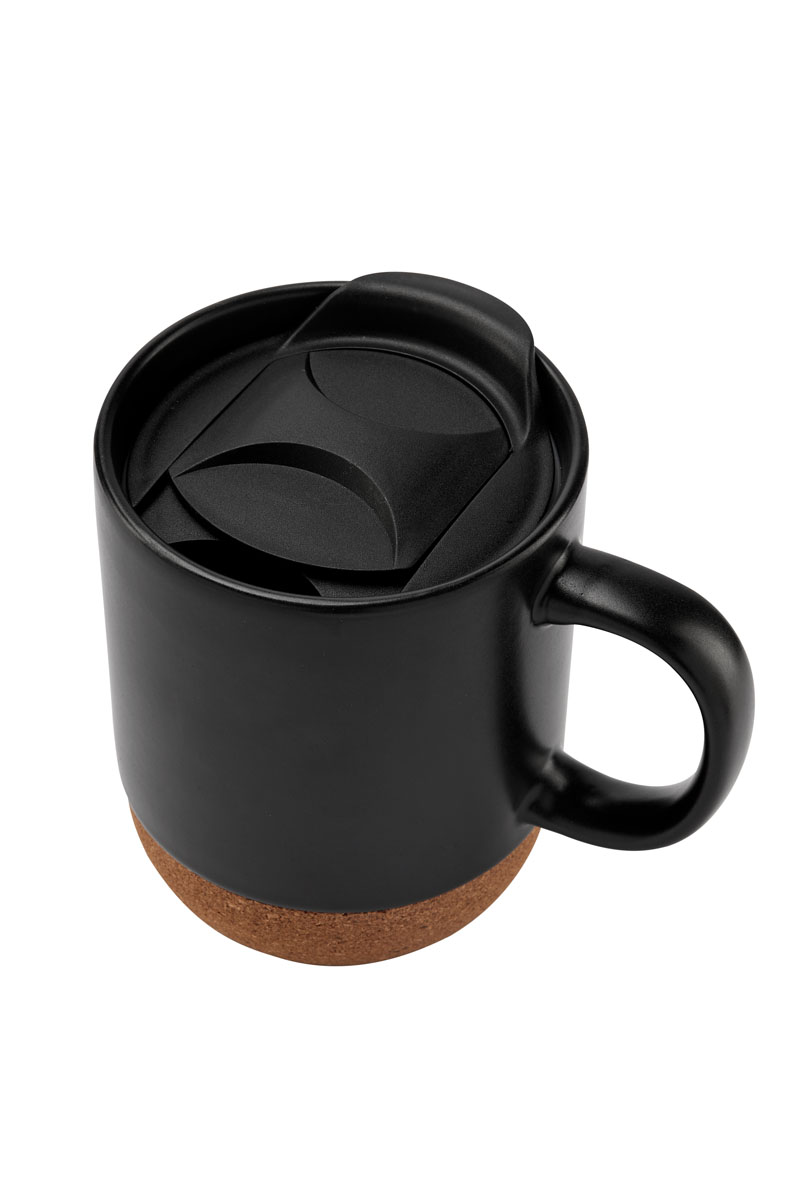 Taza de cerámica terminado mate. Base de corcho. Incluye tapa de plástico con válvula de seguridad.