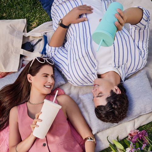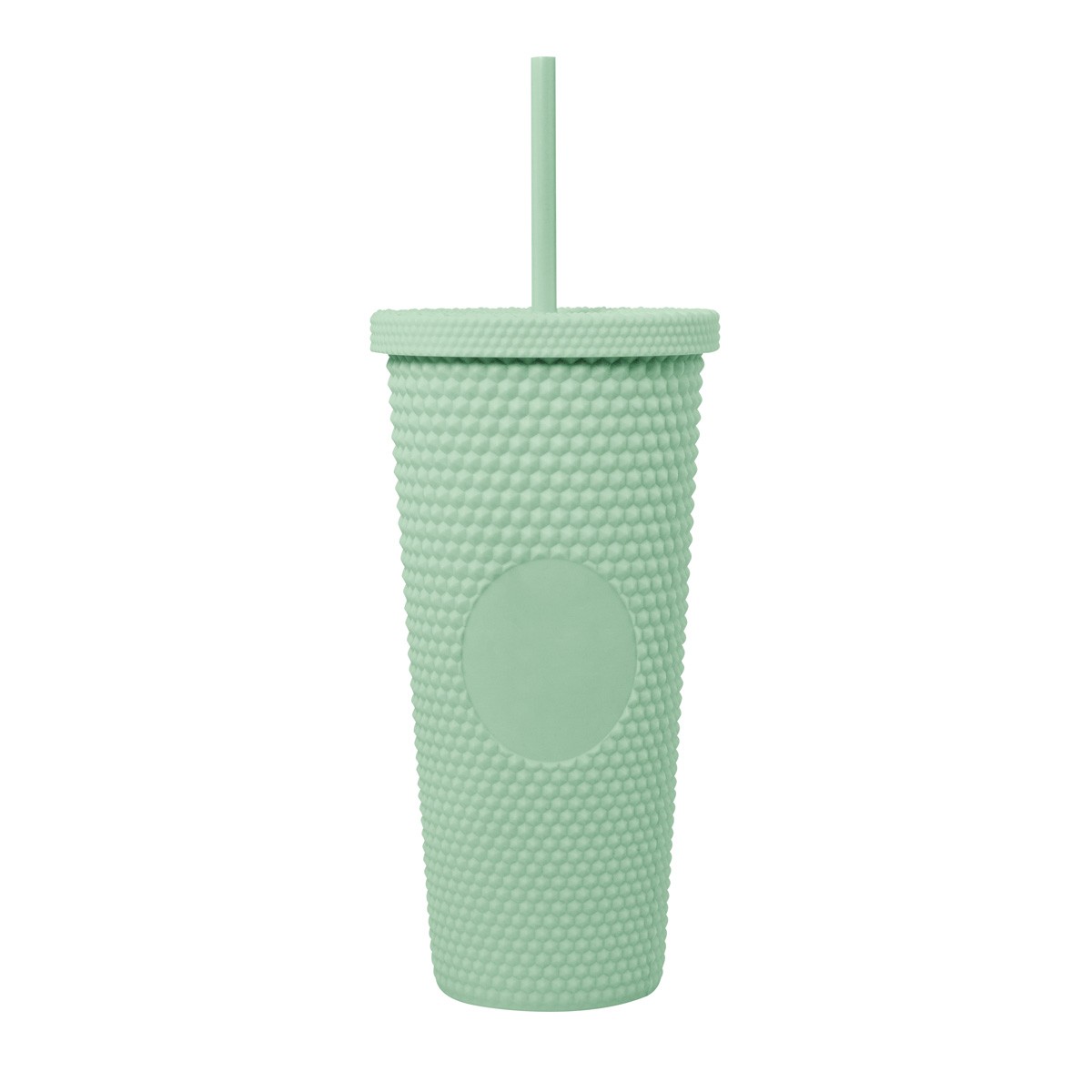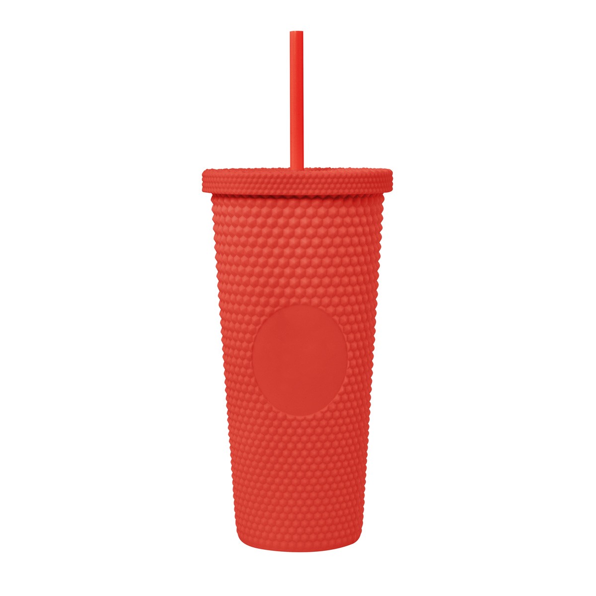 Doble pared. Pared interna y externa de plástico. Tapa de plástico con sistema de rosca. Incluye popote. Cuerpo y tapa con textura diamante y terminado tipo rubber. Capacidad 22 Oz. Base de 6.8 cm de diámetro. Caja individual incluida.