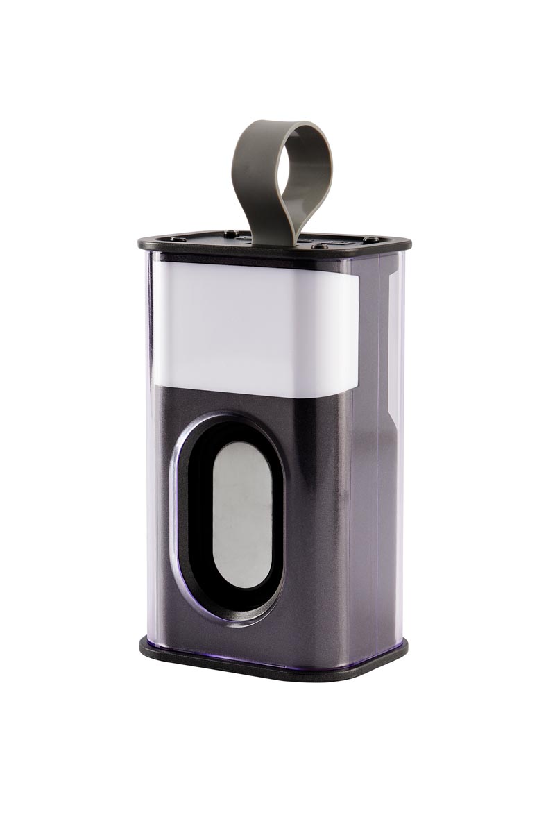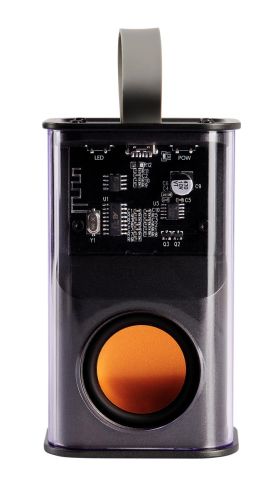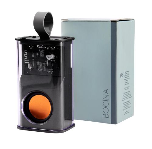 Bocina bluetooth recargable. Luz RGB con 7 efectos diferentes. Reproduccion de musica por 3 horas aproximadamente. Tiempo de carga 2-3 horas. Alcance de conexion de 10 metros. Bateria de 500 mAh. Conexion tipo C. Incluye cable auxiliar y asa de silicon pa