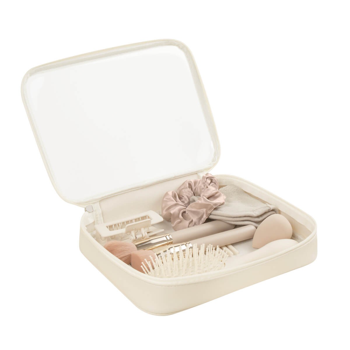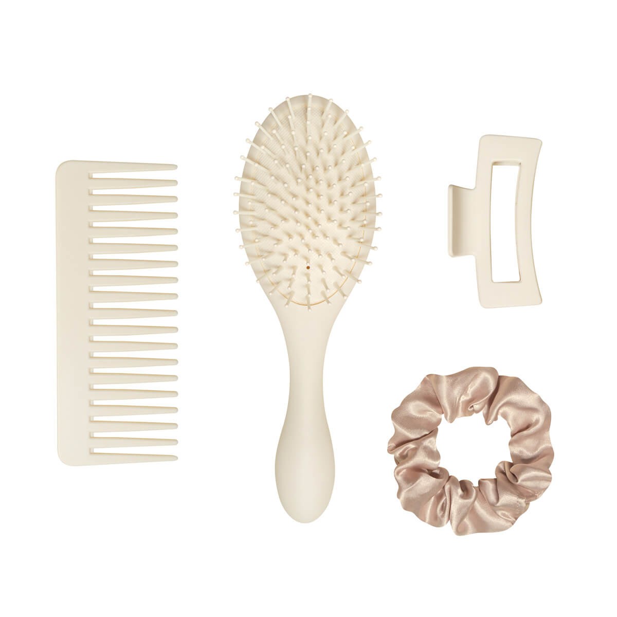 Complementa tu rutina para el cuidado del cabello con este set que incluye 1 cepillo, 1 peine, 1 pinza y 1 dona. Cada accesorio, hecho con materiales suaves al tacto, se mantiene perfectamente ordenado dentro de su estuche de curpiel.