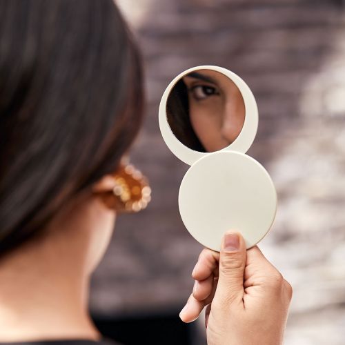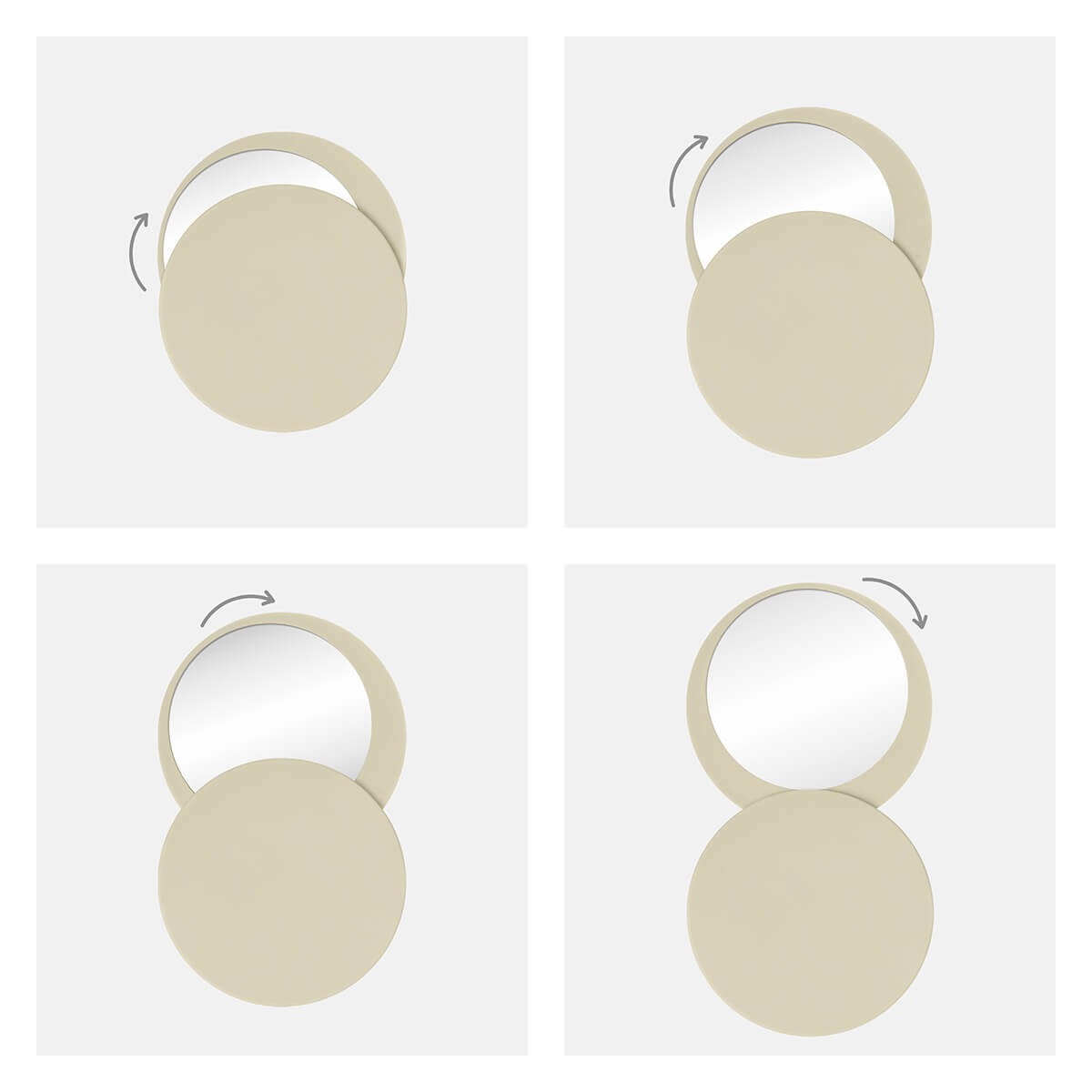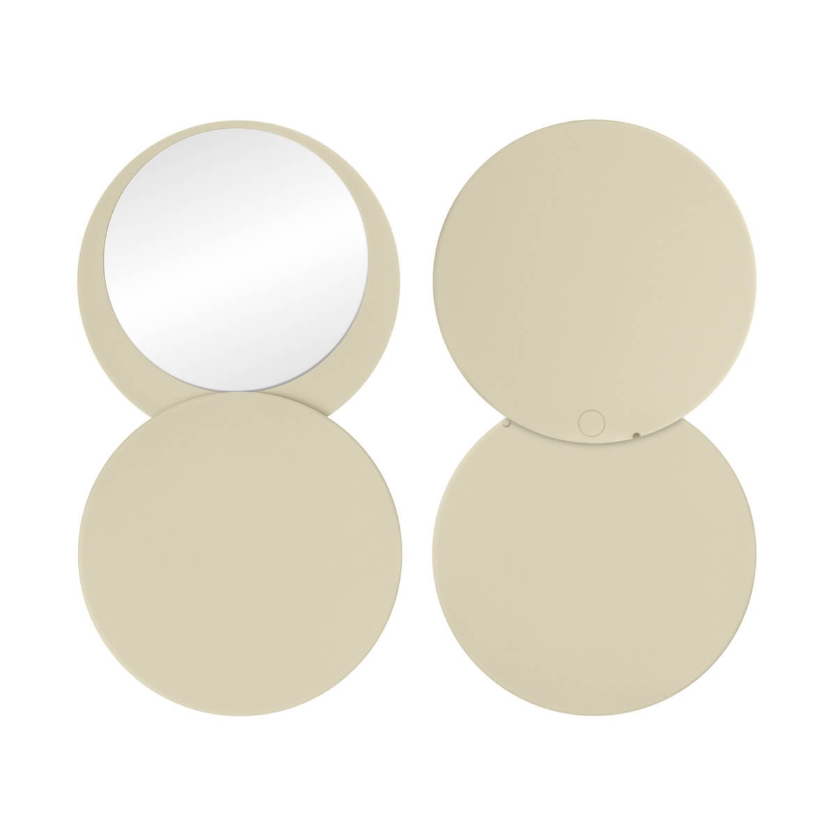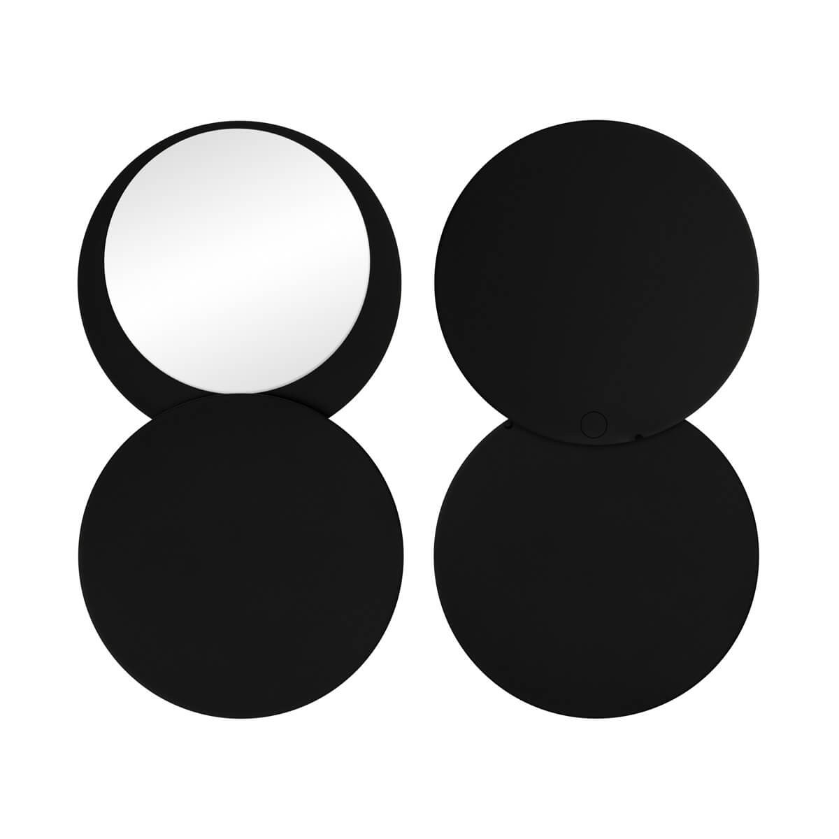 Espejo circular compacto suave al tacto. Incluye una tapa giratoria deslizable que protege el espejo mientras no lo usas. Perfecto para retoques rapidos o como un esencial en tu bolsa de viaje.