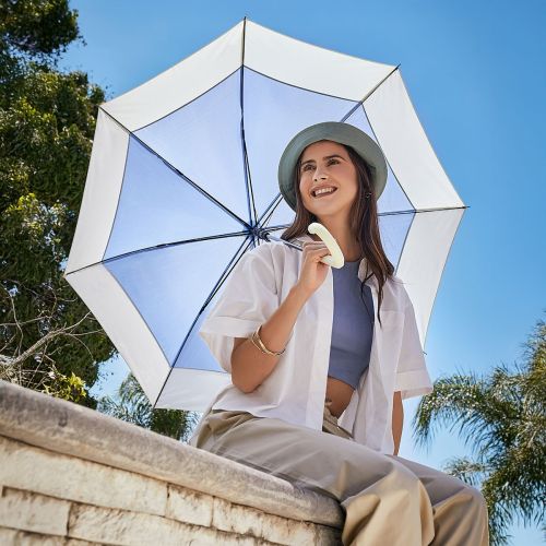 Paraguas de 8 paneles en diseno bitono con apertura automatica. Su mango octagonal de plastico ofrece un agarre comodo y unico. Mango de plastico