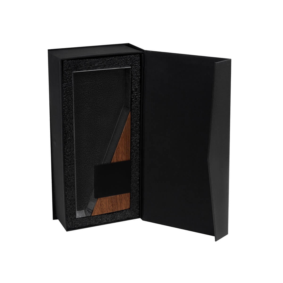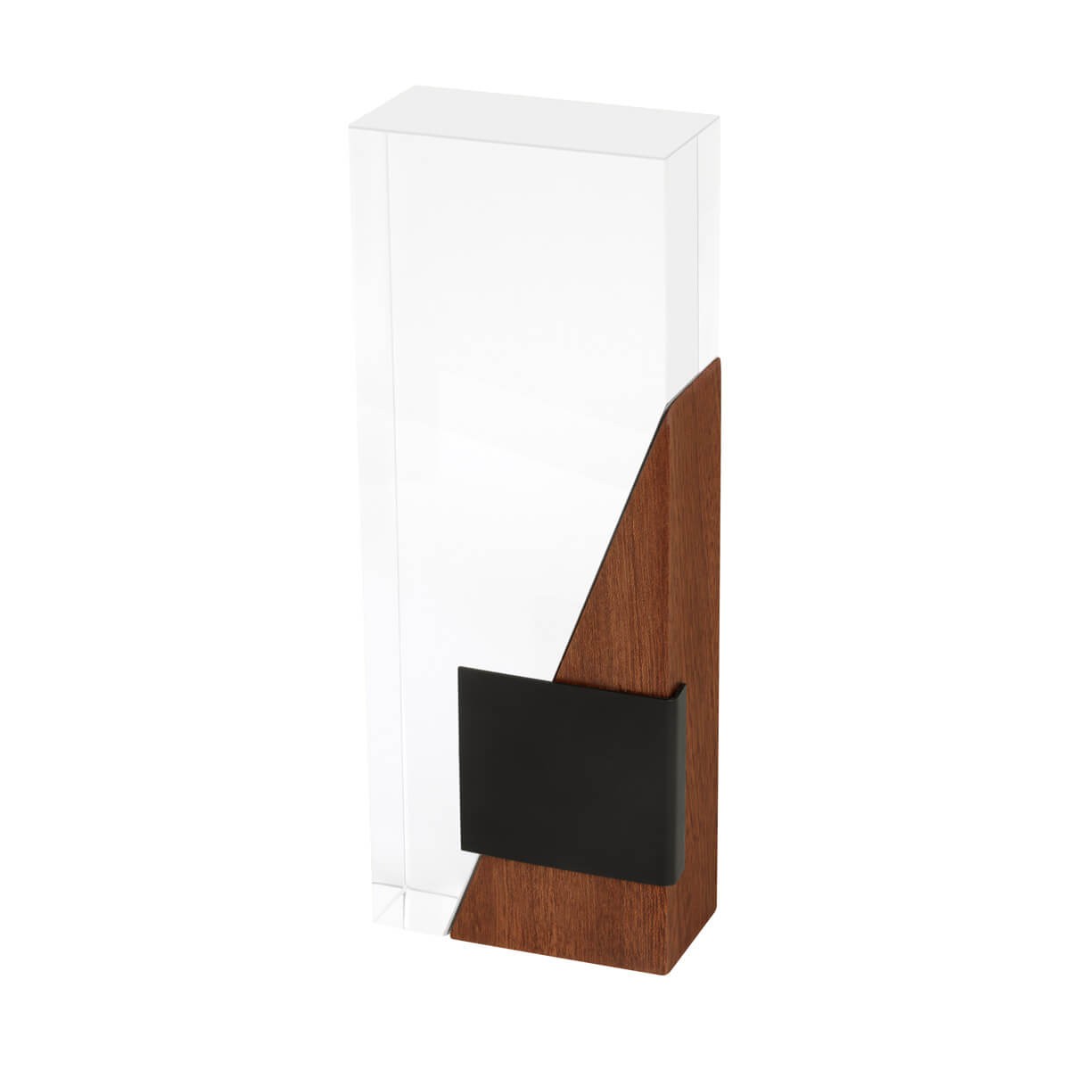 Reconocimiento asimetrico que combina materiales como vidrio, madera y metal, destacando un diseno moderno y minimalista. Cuenta con una placa metalica para su facil grabado. Destaca un evento memorable, una mencion honorifica o celebracion especial. Incl