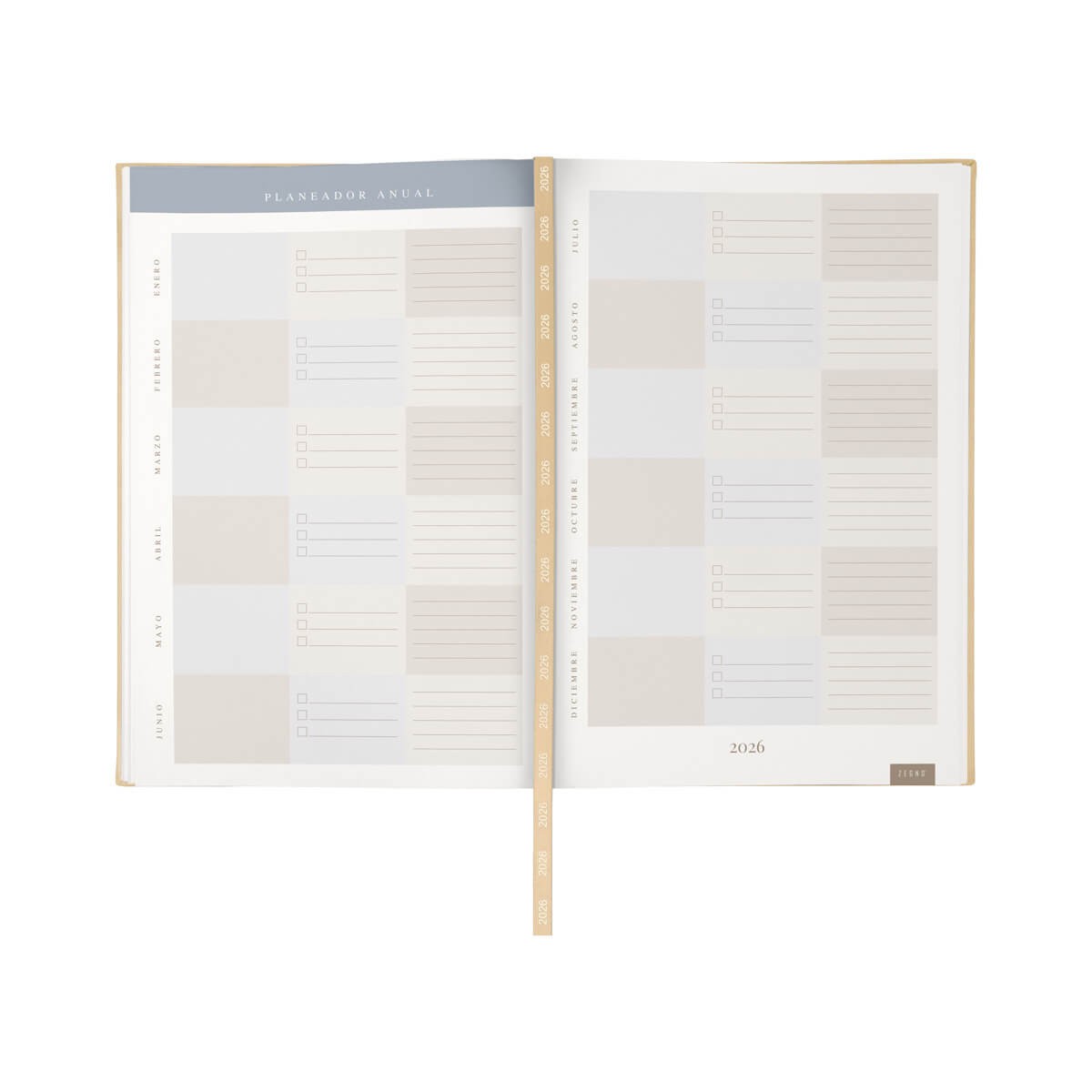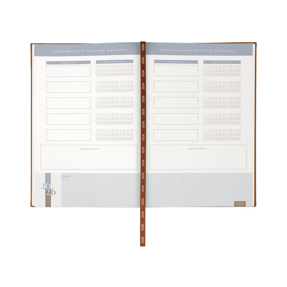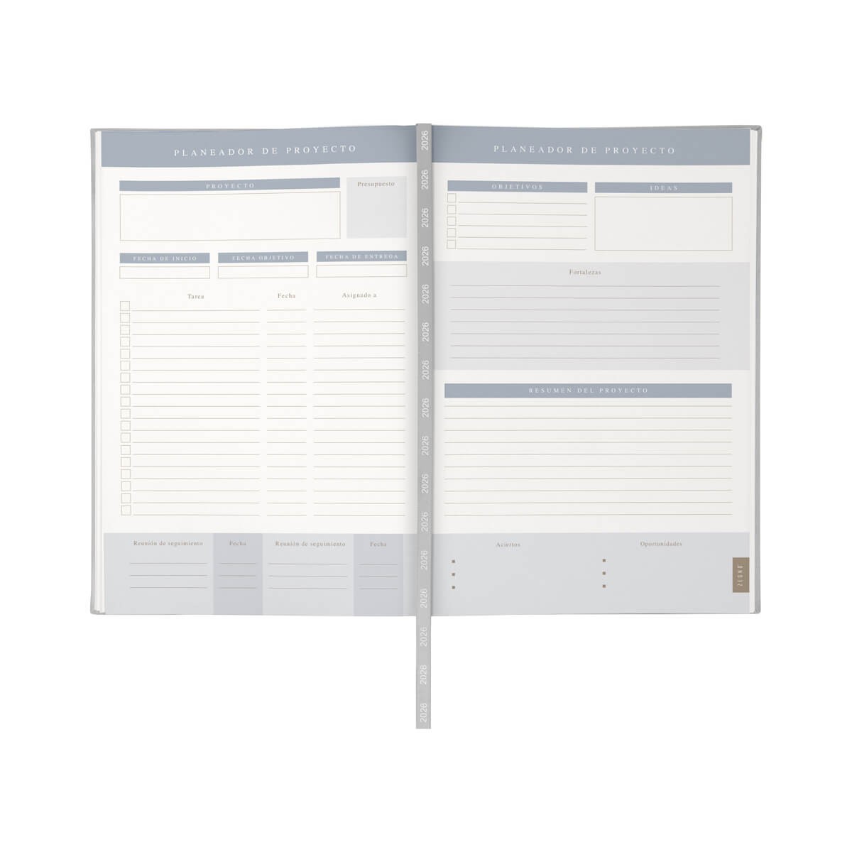 Agenda diaria con 186 hojas. Contiene datos personales, calendarios 2025-2026-2027, planeador 2026, presupuesto de gastos, seguimiento de nuevos habitos, organizador de tareas, planeador de proyectos