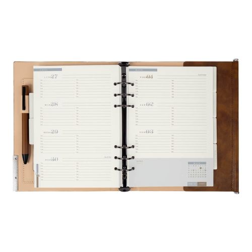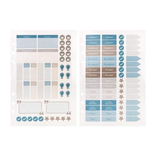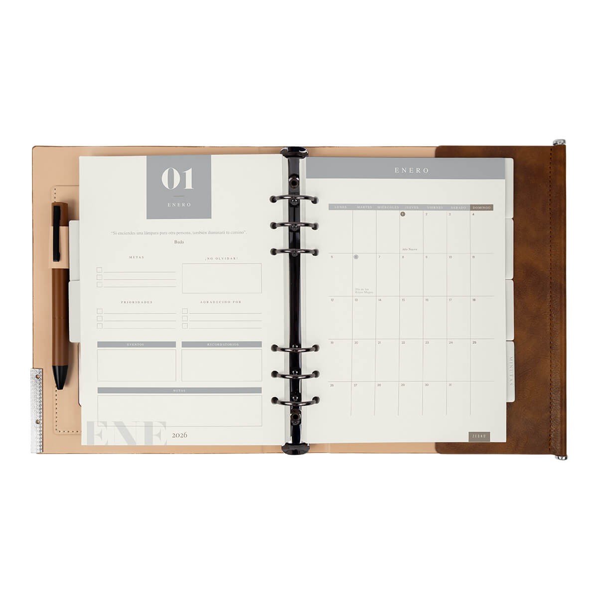 Agenda semanal con 140 hojas. Contiene datos personales, calendarios 2025-2026-2027, planeador 2026, presupuesto de gastos, seguimiento de nuevos habitos, organizador de tareas, planeador de proyectos y dias festivos. Incluye 7 secciones de separador de c