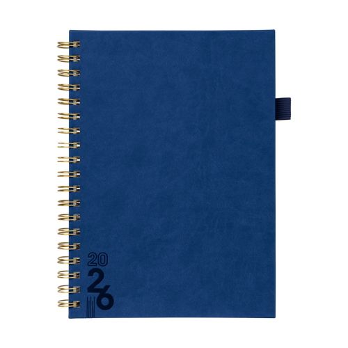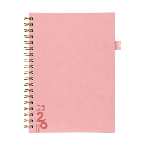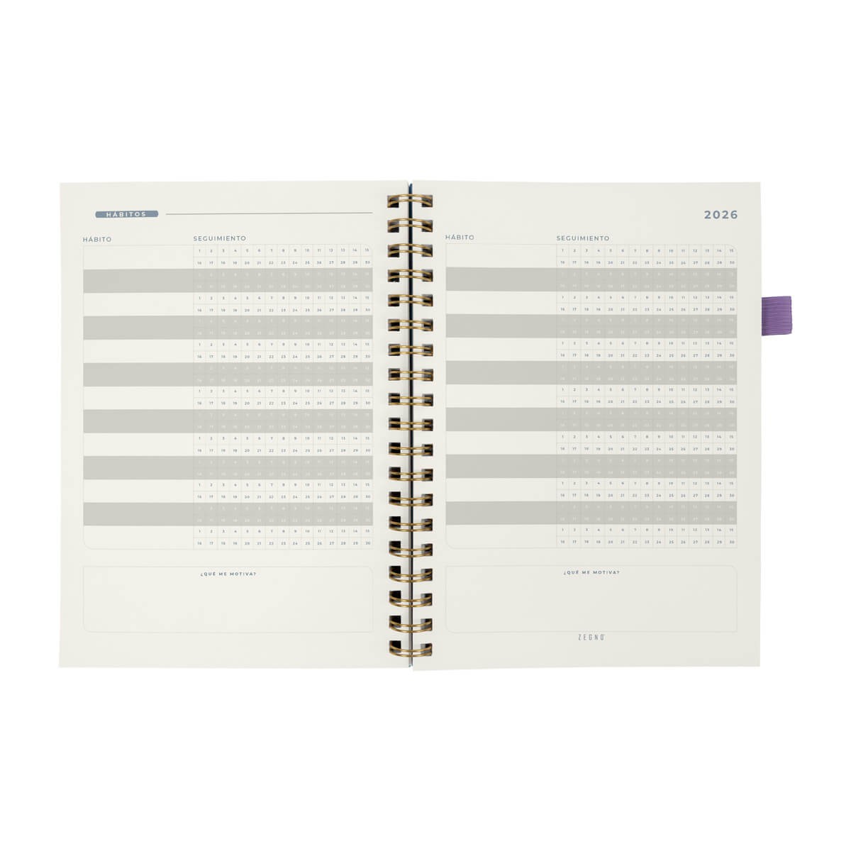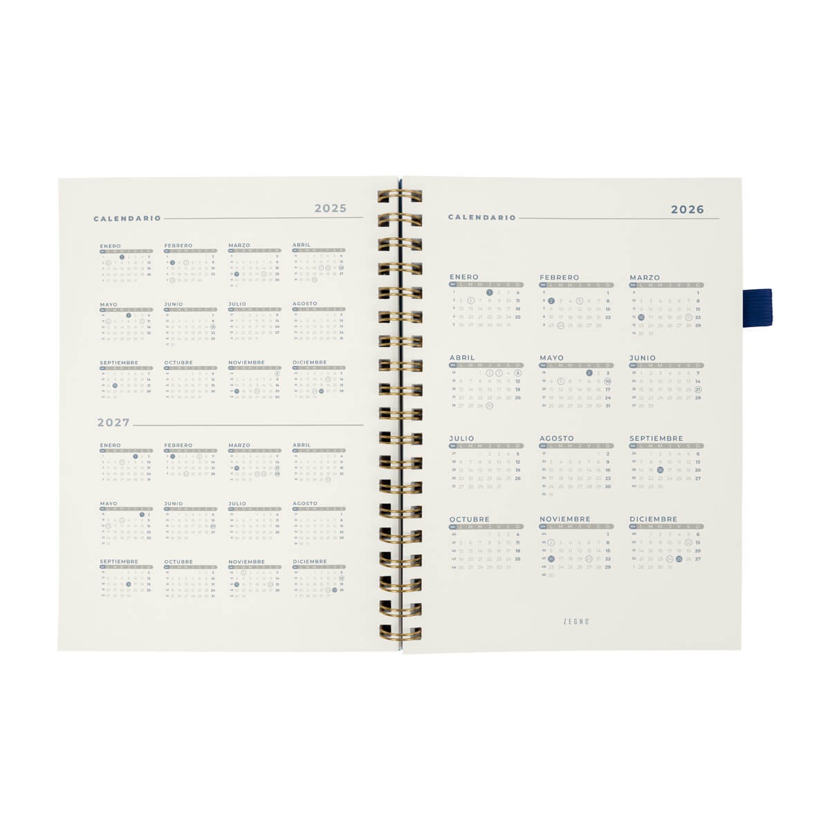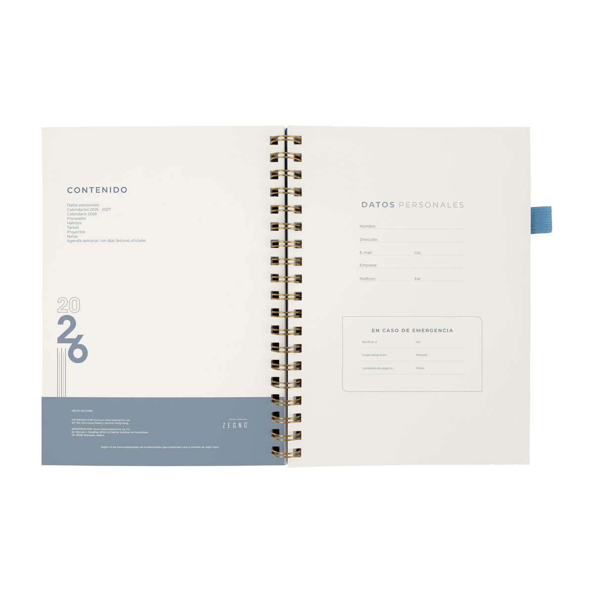 Agenda semanal con 80 hojas. Contiene datos personales, calendarios 2025-2026-2027, planeador 2026, seguimiento de nuevos habitos, organizador de tareas, planeador de proyectos y dias festivos. Incluye caja individual del mismo color a la agenda y boligra