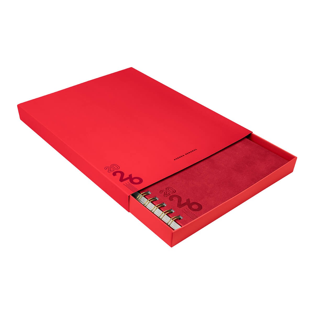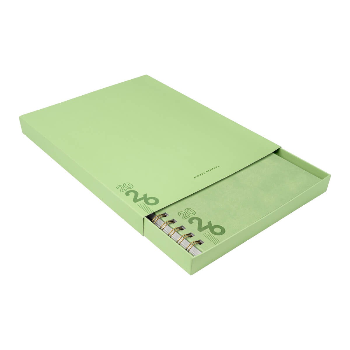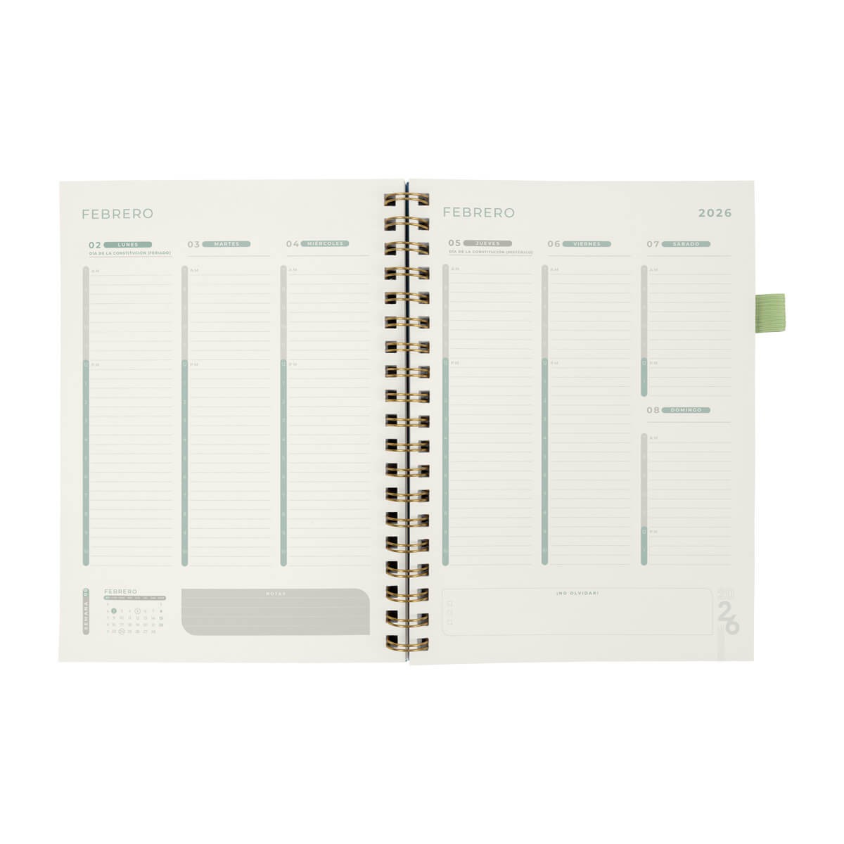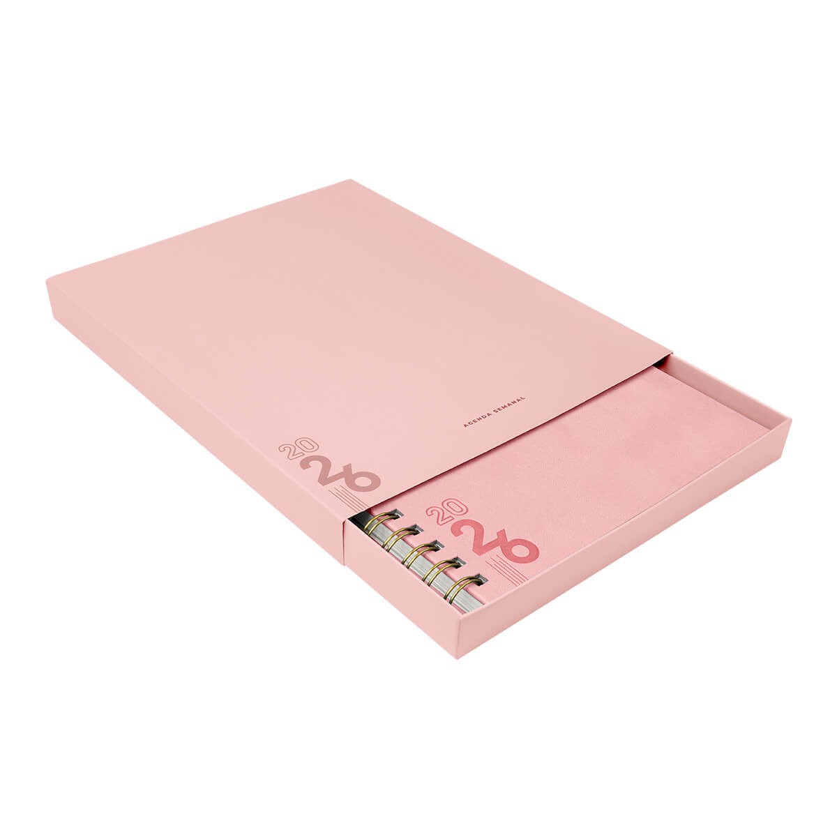 Agenda semanal con 80 hojas. Contiene datos personales, calendarios 2025-2026-2027, planeador 2026, seguimiento de nuevos habitos, organizador de tareas, planeador de proyectos y dias festivos. Incluye caja individual del mismo color a la agenda y boligra