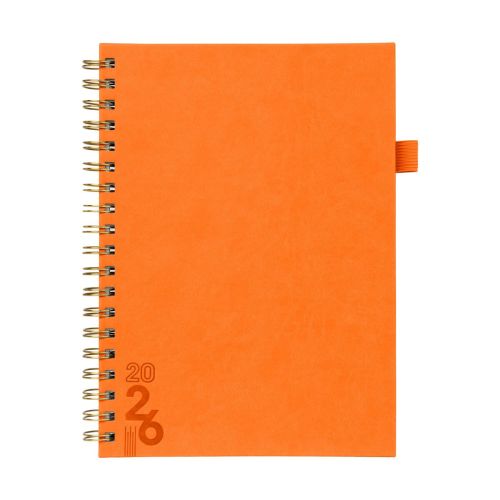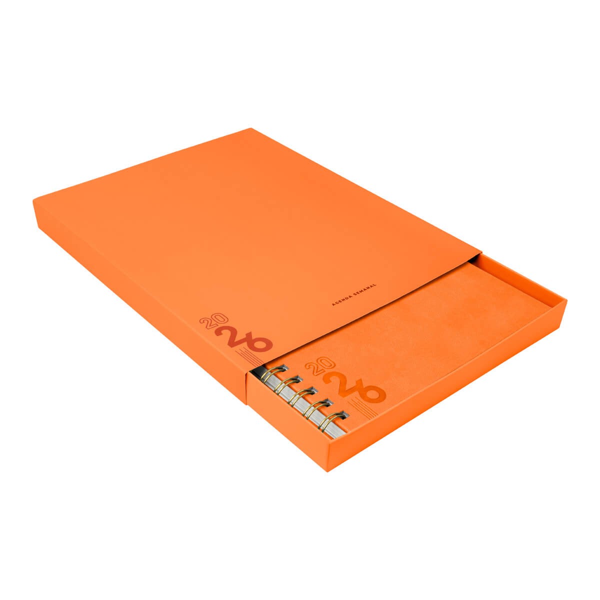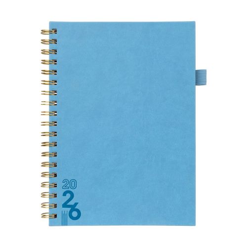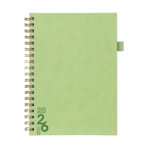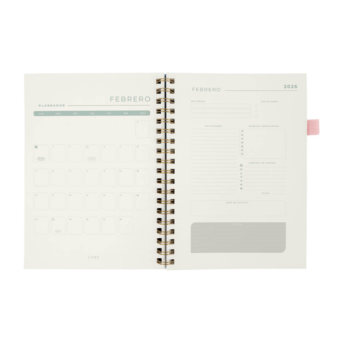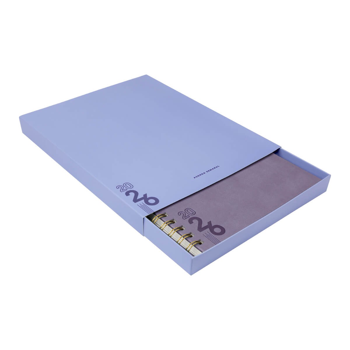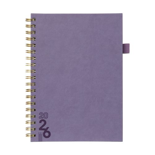 Agenda semanal con 80 hojas. Contiene datos personales, calendarios 2025-2026-2027, planeador 2026, seguimiento de nuevos habitos, organizador de tareas, planeador de proyectos y dias festivos. Incluye caja individual del mismo color a la agenda y boligra