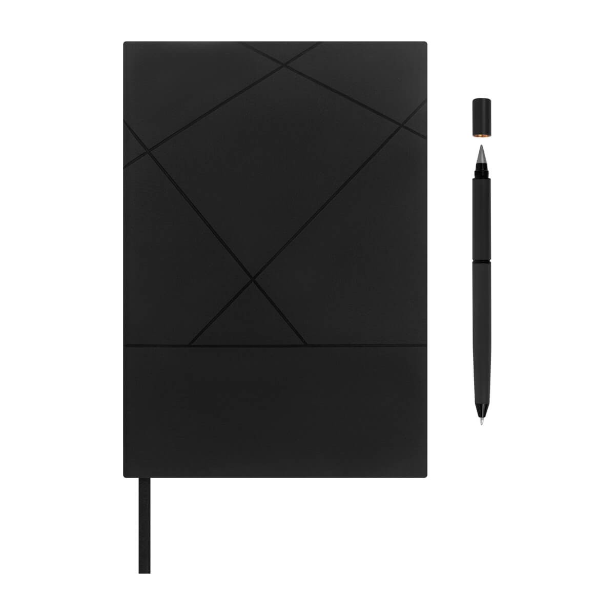 Elegante y original set de regalo que consta de, libreta con 100 hojas a rayas, cubierta rígida de curpiel y listón separador. Como complemento, cuenta con un bolígrafo de metal con terminado mate, con punta clásica y la funcionalidad de un lápiz infinito