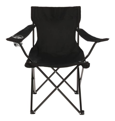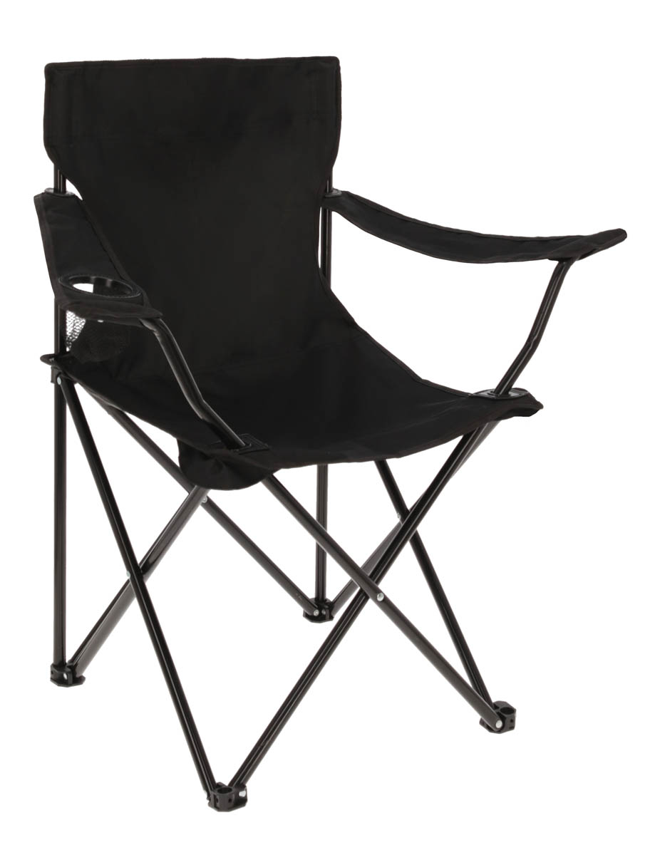 Silla plegable de fácil armado con reposabrazos, porta vasos de malla y funda con jareta y correa.