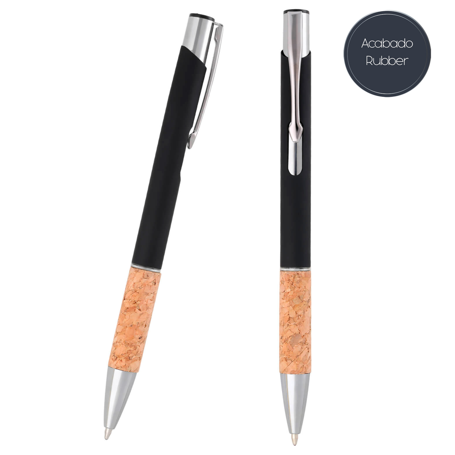 Bolígrafo con acabado rubber; grip de corcho y mecanismo de click.