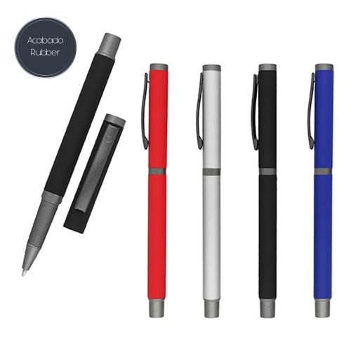 Bolígrafo metálico acabado rubber con detalles en base y tapa color gris.