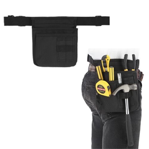 Cinturón porta herramientas con compartimentos; correa ajustable y broche de seguridad.