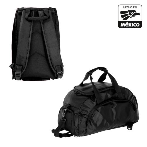 Maleta deportiva que se convierte en mochila; con 2 broches de seguridad ajustables y tirantes acolchonados. Incluye zapatera y dos compartimentos exteriores; asas y correa ajustable.