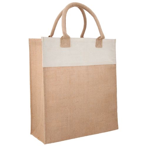 Bolsa de yute y algodón con interior plastificado con asas y fuelle.
