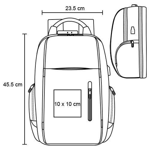 Mochila de seguridad con 2 compartimentos; porta laptop de 18; 2 compartimentos laterales; 2 compartimentos frontales; asa de aluminio; candado de seguridad y puerto de carga USB."