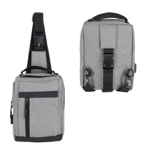 Bolsa de hombro con 2 compartimentos; 1 compartimento principal con bolsa interna y entrada lateral de batería portátil; 1 compartimento frontal; doble correa ajustable; broche de seguridad y asa superior.