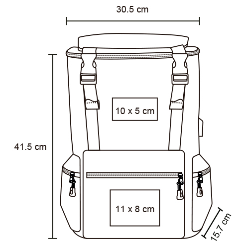 Mochila de 1 compartimento principal con espacio para porta laptop; 1 bolsa interna; 1 bolsa frontal; dos bolsas laterales con cierre; 1 bolsa en parte superior; broches; carry on y asa superior.