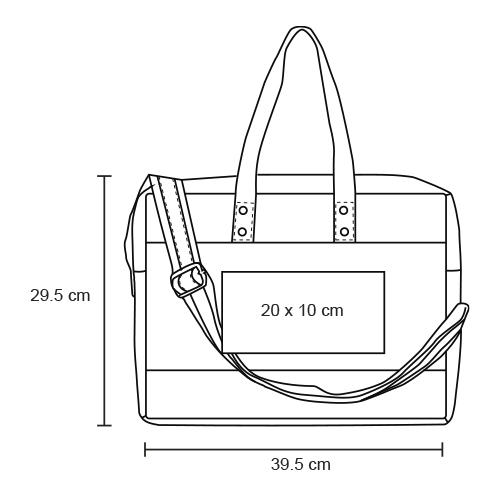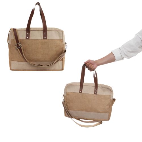 Portafolio de yute laminado con interior de algodón; 1 compartimento con broche de velcro para porta laptop; cierre; correa ajustable y asas.