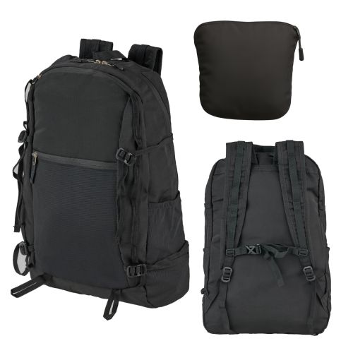 Mochila con compartimento principal con porta laptop de 16; dos compartimentos frontales; dos bolsas laterales con elástico y tirantes con broches."
