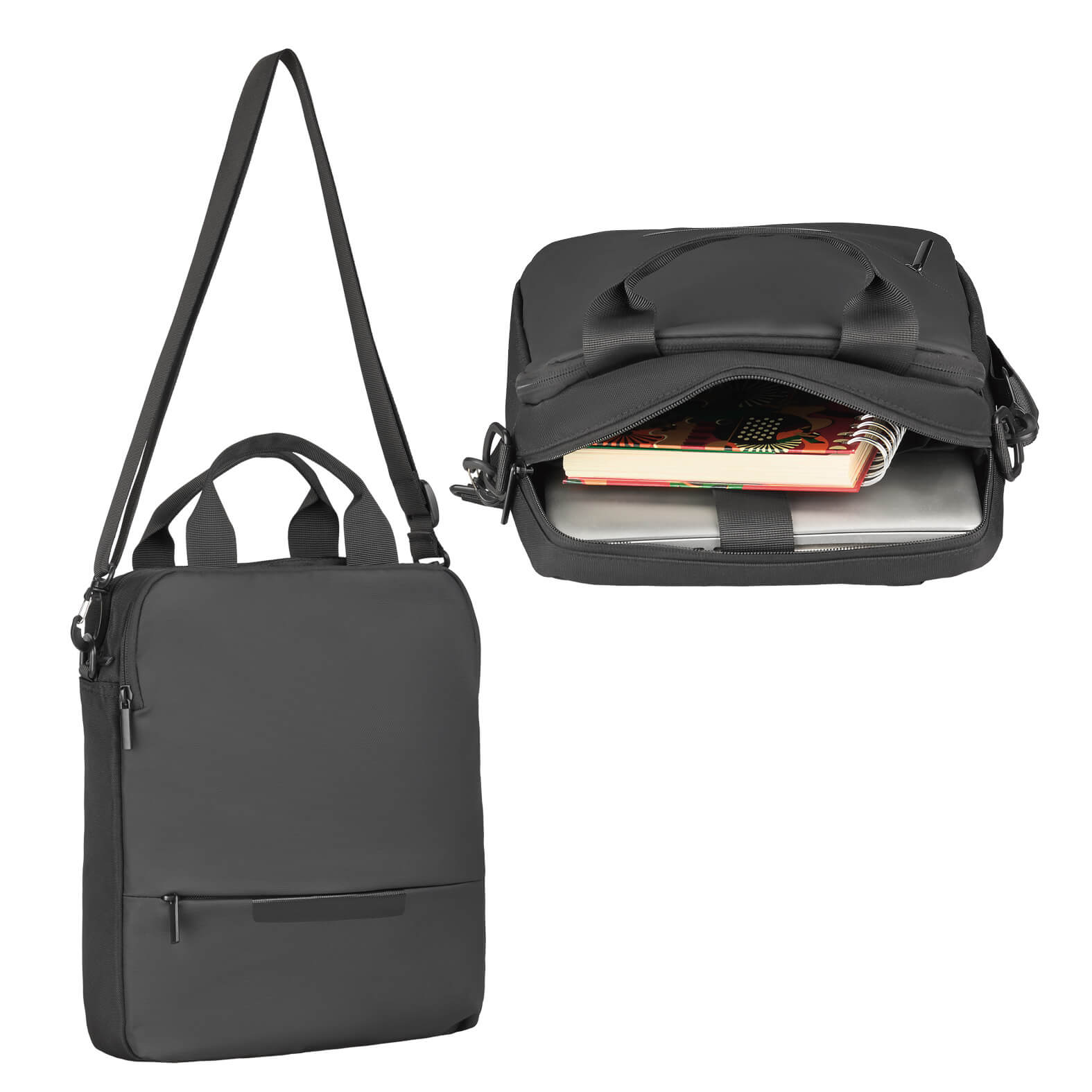 Portafolio de poliéster con compartimento principal amplio y porta laptop de hasta 15; dos bolsillos frontales con cierre; bolsa trasera con cierre; asas y correa ajustable."