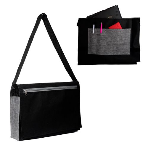 Portafolio con compartimento principal para laptop de hasta 15; organizador frontal; solapa con cierre de velcro; bolsa trasera con cierre y correa ajustable."