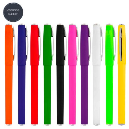 Bolígrafo con acabado rubber; tinta de gel y clip metálico.