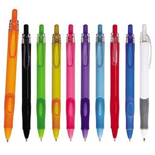 Bolígrafo de plástico de color sólido con clip transparente y grip de goma.