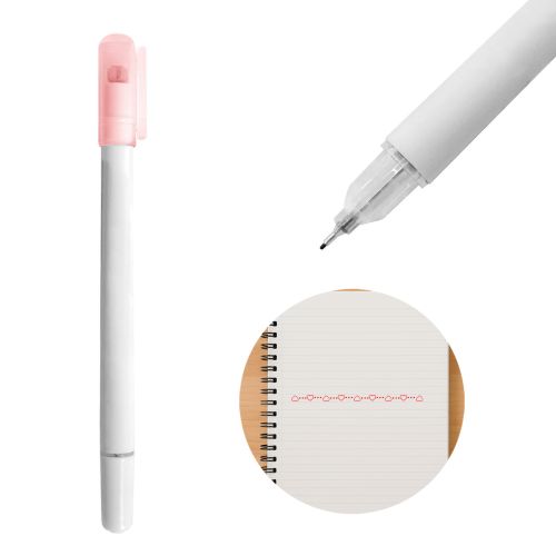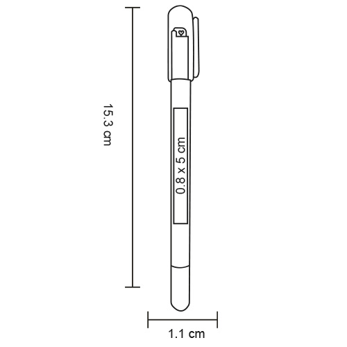 Bolígrafo de plástico con punta fina en el extremo inferior y sello de línea con figura de corazón en el extremo superior.