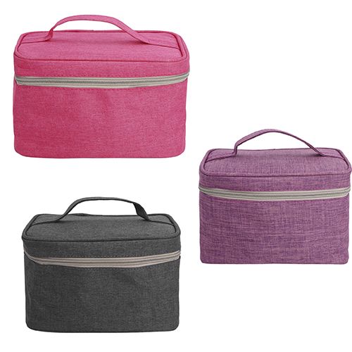 Cosmetiquera de poliéster en forma rectangular con dos compartimientos y asa.