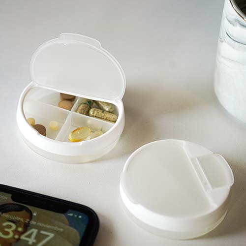 Pastillero de plástico con 4 compartimentos; 2 broches; tapa traslúcida y parte superior giratoria.