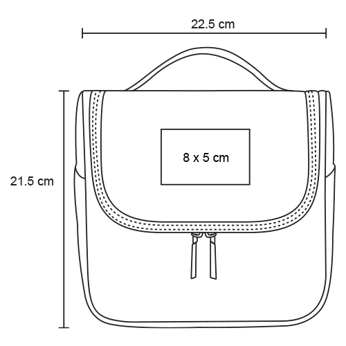 Estuche de viaje; en la parte interior cuenta con un gancho; 3 separadores; 2 bolsas de malla laterales y un compartimento de malla con cierre en la parte superior; por la parte exterior incluye 2 bolsas laterales y asa.