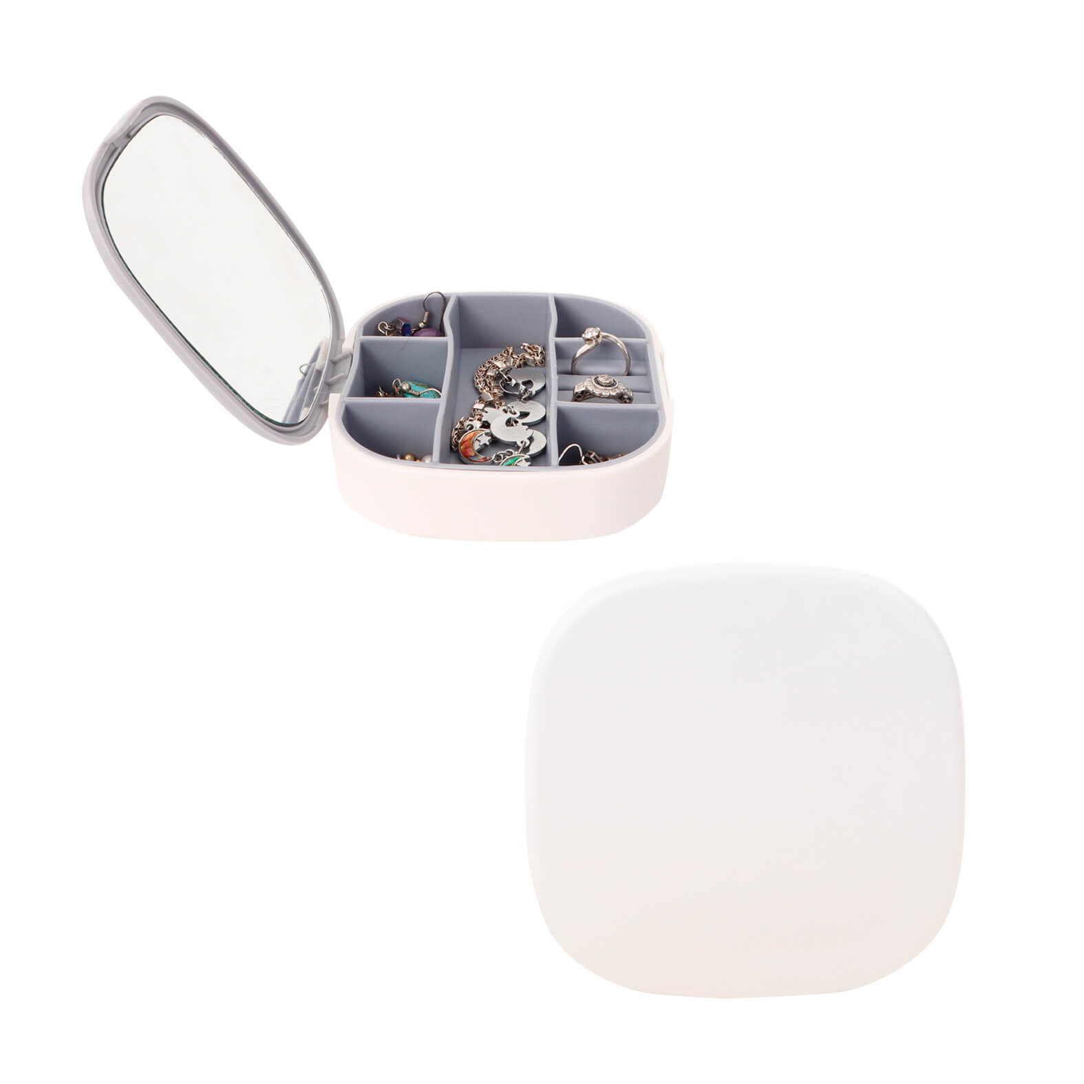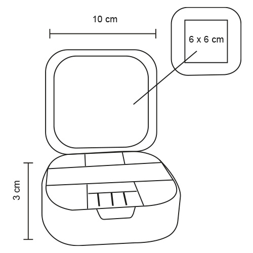 Organizador de joyas; cuenta con 6 compartimentos para accesorios; 3 ranuras para anillos y 1 espejo en la parte interior.