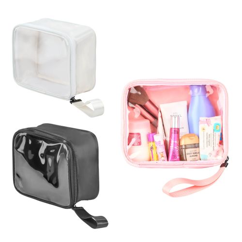 Cosmetiquera rectangular de plástico con frente transparente; cierre y asa.
