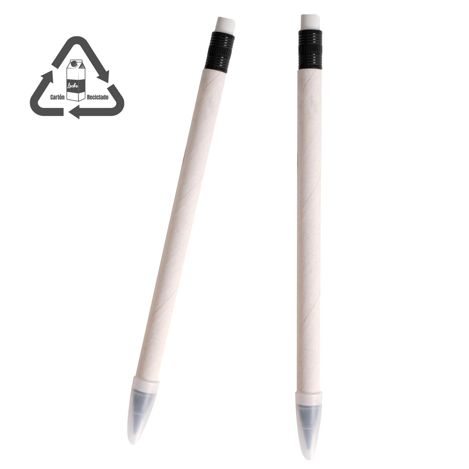 Bolígrafo ecológico fabricado a partir de cartones de leche reciclados. Su punta especial se oxida al contacto con el papel; permitiendo una escritura sostenible y duradera. Incluye una goma para mayor practicidad.