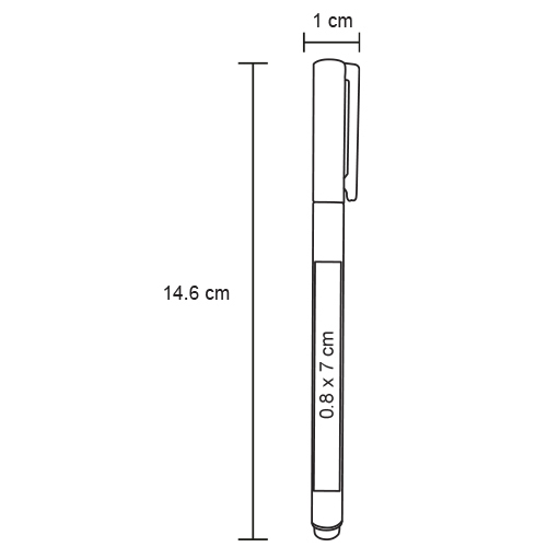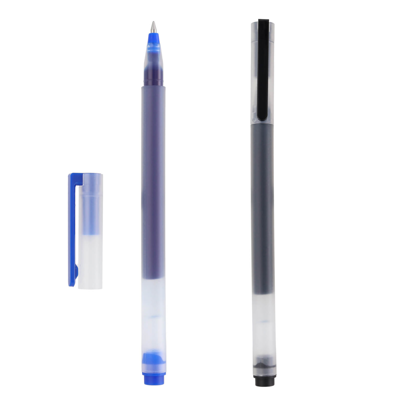 Bolígrafo de plástico con tinta de gel; tapa traslúcida y clip de plástico. La tinta viene del color de la pluma. (negro y azul)