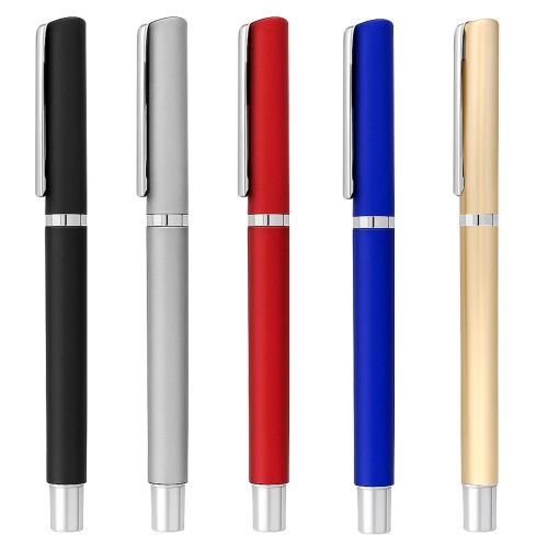 Bolígrafo de plástico con tinta gel; apariencia metálica y clip metálico.