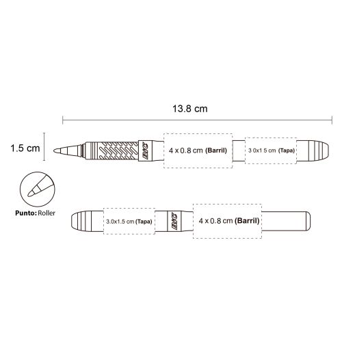 Bolígrafo de plástico con punto roller; tapa con clip y grip de goma.