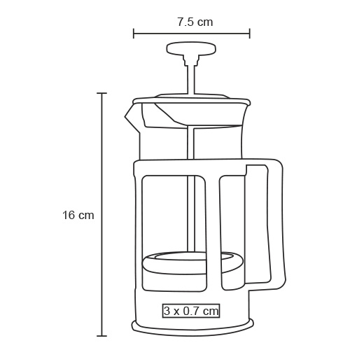Cafetera de cristal tipo francés con base y tapa de plástico; filtro de acero inoxidable.