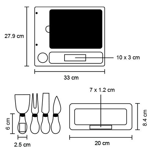 Tabla para quesos con piedra; incluye 1 mini cuchillo de pala; 1 mini tenedor para quesos; 1 cuchillo de avión estrecho; un cuchillo y un mini plato de cerámica.