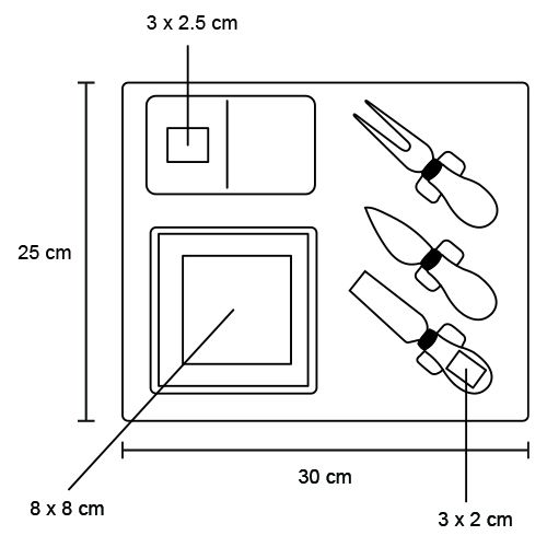 Tabla de quesos que incluye mini plato de cerámica doble; 1 cuchillo de avión estrecho; un cuchillo y un tenedor.