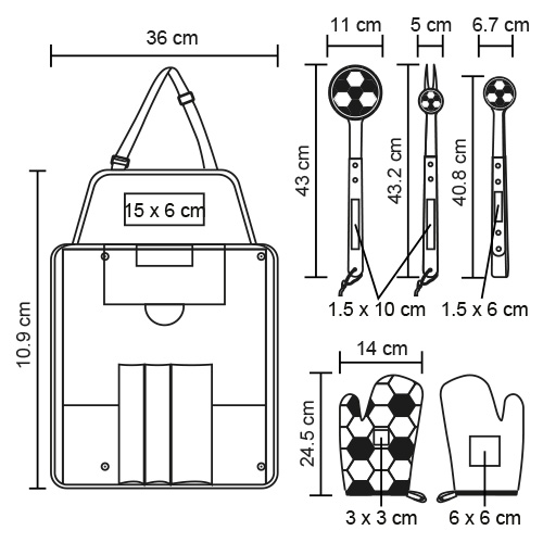 Set de BBQ en estuche con diseño de cancha de fútbol que también funciona como mandil. Incluye guante; pinzas; tenedor asador y volteador.
