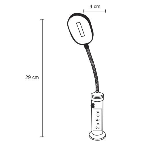 Lámpara portátil metálica con luz LED que enciende con 3 baterías AAA (no incluidas); botón de encendido de click; soporte flexible e imán en la parte inferior.