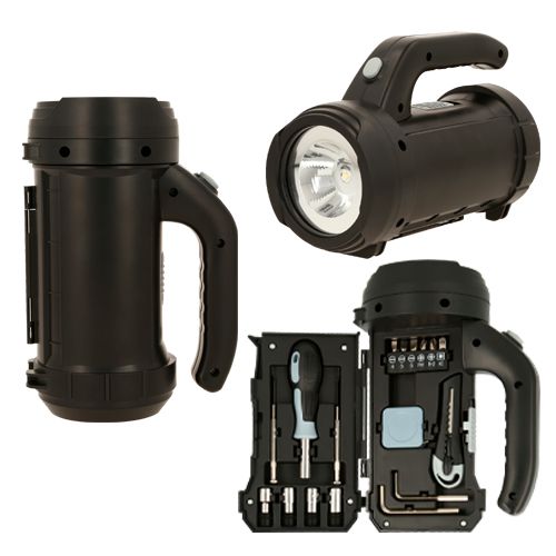 Linterna portátil 2 en 1. Lámpara de LED y apartado de herramientas en el costado. Incluye 17 accesorios: 1 metro; 1 cutter; 2 llaves Allen; 2 destornilladores de precisión; 1 mango; 5 puntas intercambiables y 4 dados. Requiere de 3 baterías AA; no inclui